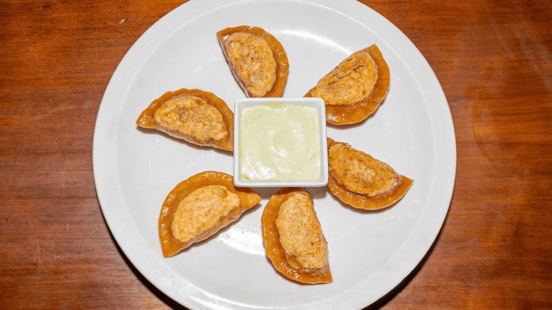 A mix of chicken and beef cooked in tomato sauce with caramelized onions and jalapeno, topped with avocado aioli and sour cream