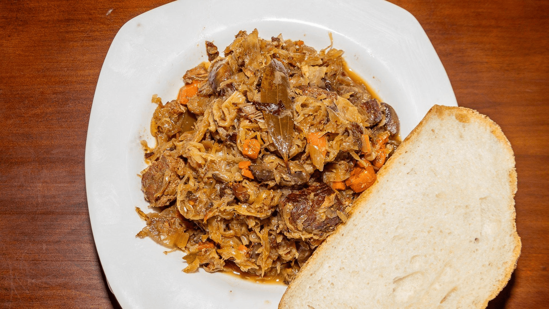 Shredded cabbage, sauerkraut, pork and beef shoulder, polish kielbasa, mushrooms, plums, spices served with bread