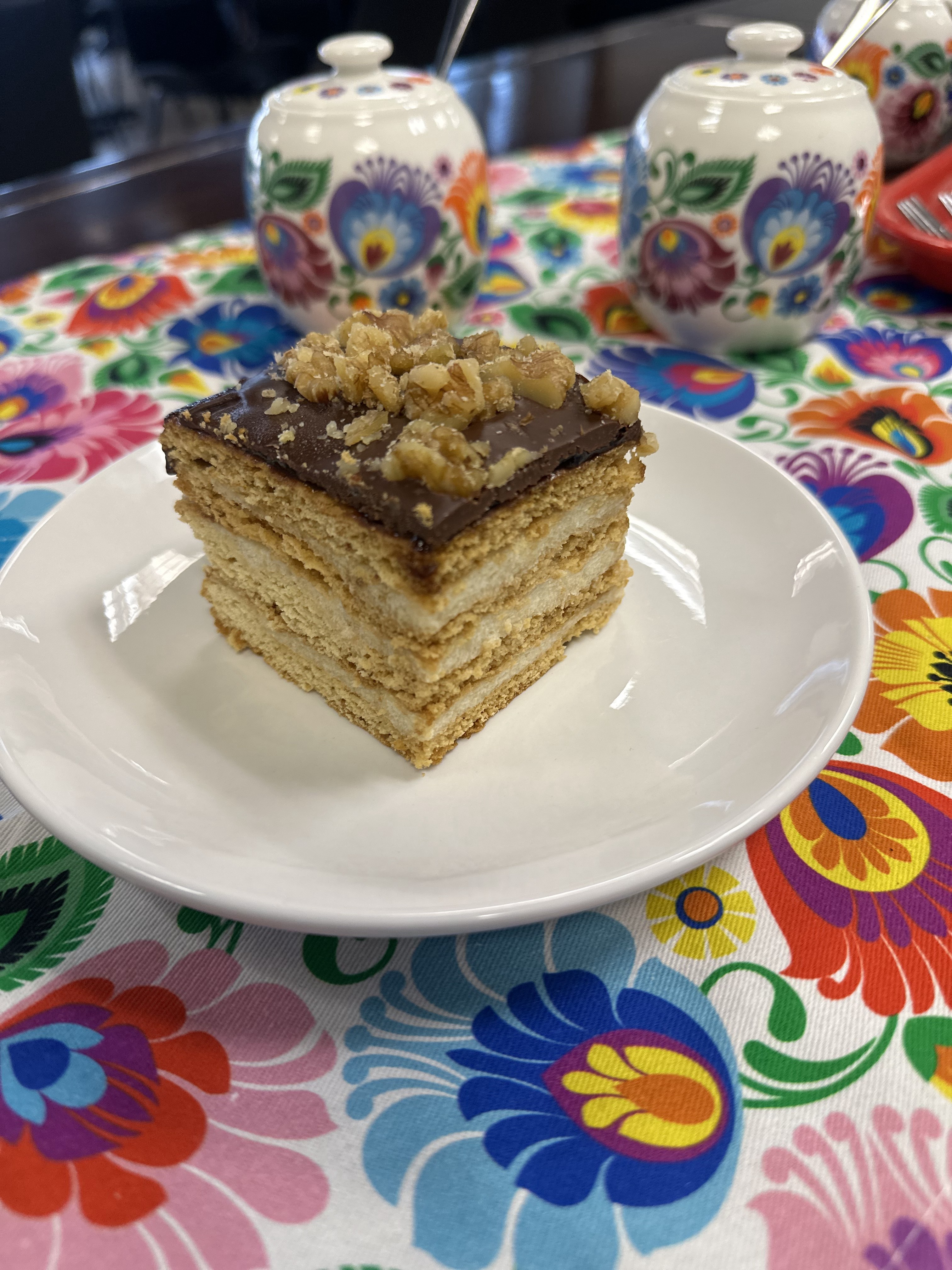 Honey-infused dough layered with pastry, made with cream of wheat, lemon, and plum butter, then topped with chocolate ganache and chopped walnuts.