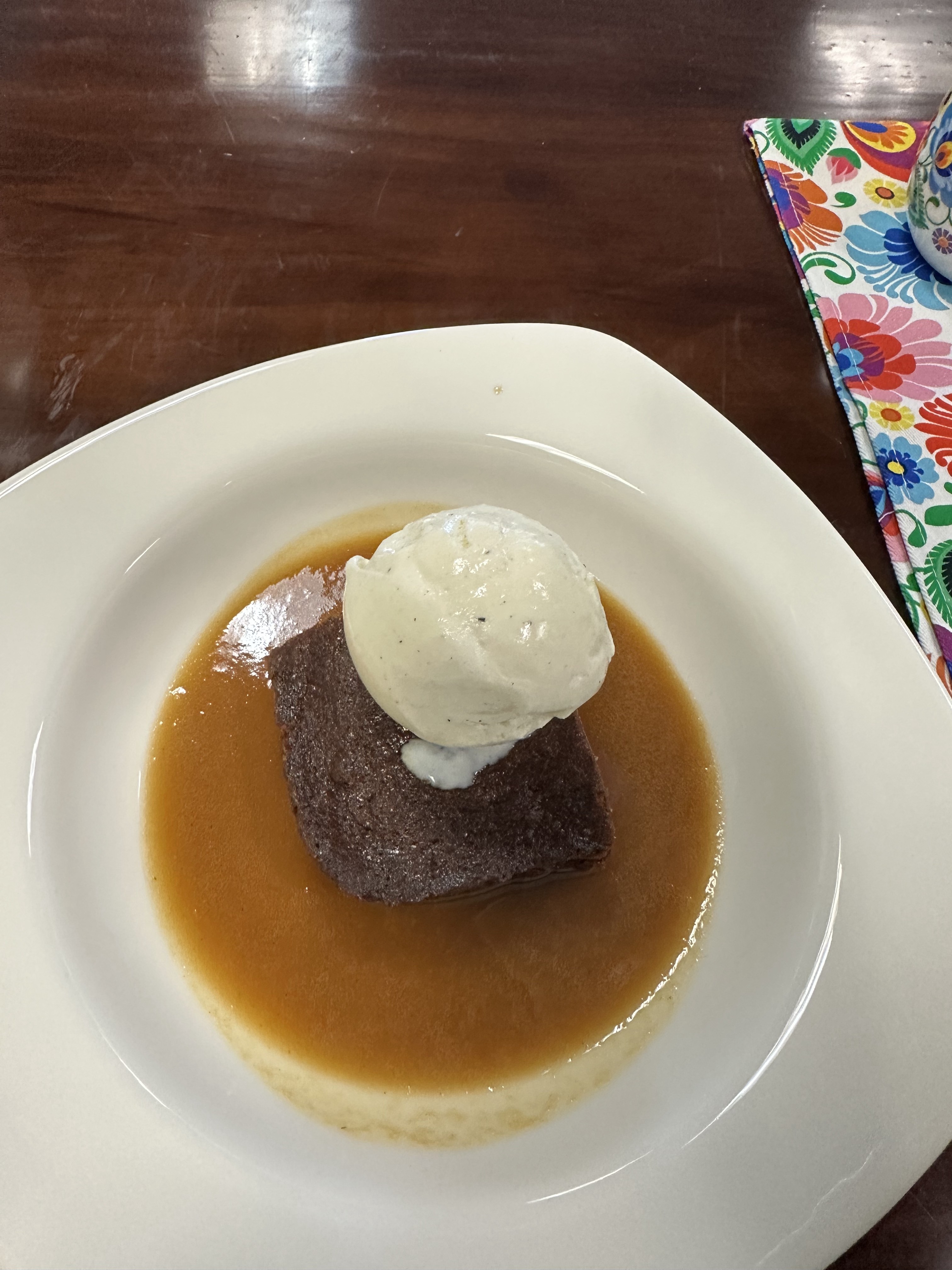 A warm, moist date sponge cake soaked in luscious toffee sauce, served with a scoop of velvety vanilla ice cream