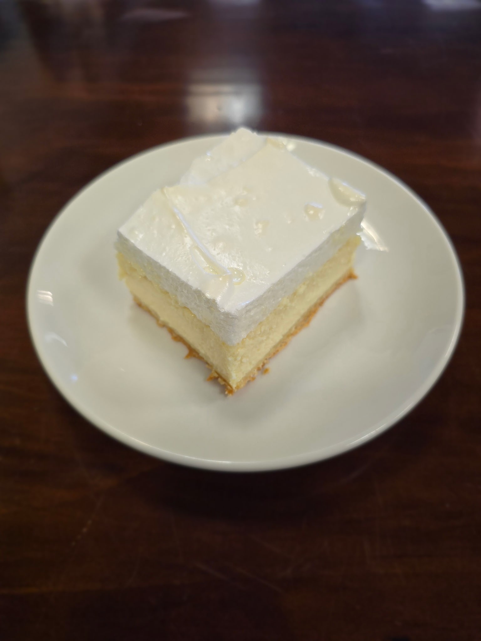 A shortbread base topped with a light and fluffy farmer’s cheese layer and soft, cloud-like meringue. The "dew" refers to the delicate drops of water that form on top of the meringue