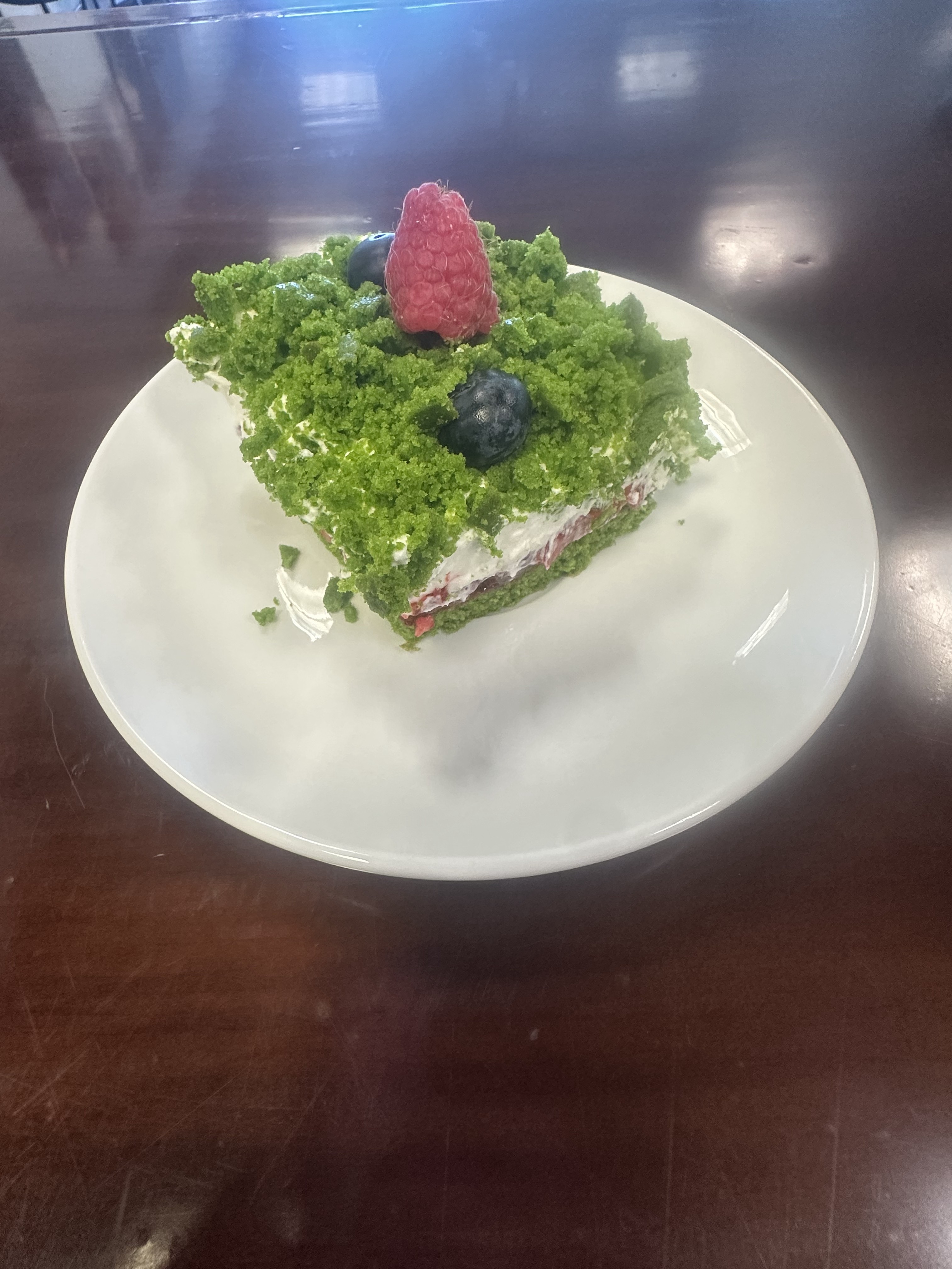 A delicate spinach sponge cake, complemented by a refreshing layer of strawberry gelatin and light whipped cream filling. The cake is beautifully encased in crumbled spinach sponge, creating a lush "moss" effect, and crowned with fresh raspberries and blueberries for a burst of natural sweetness.