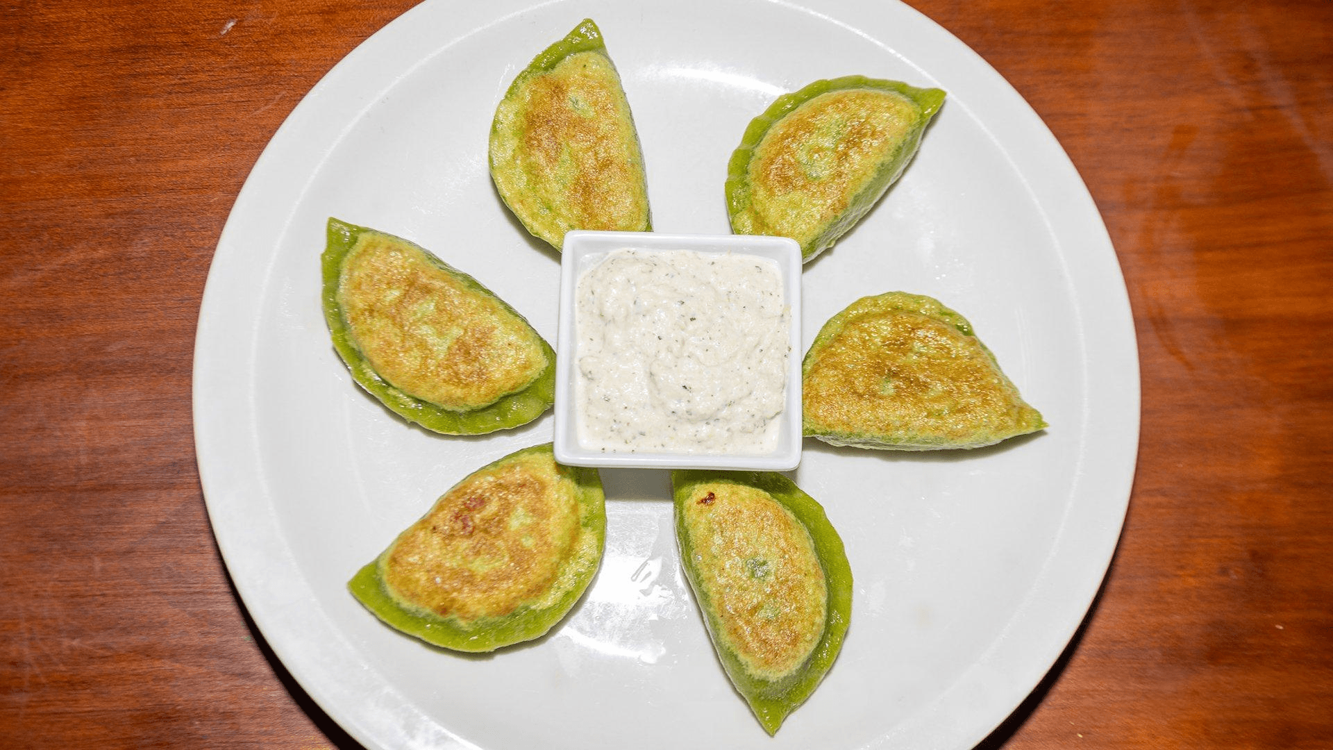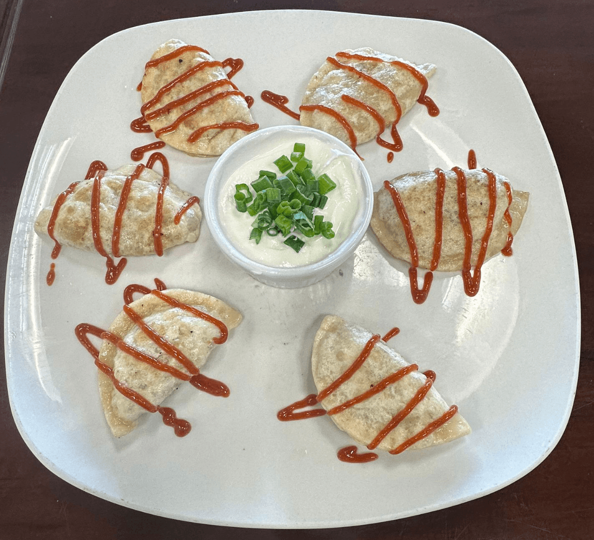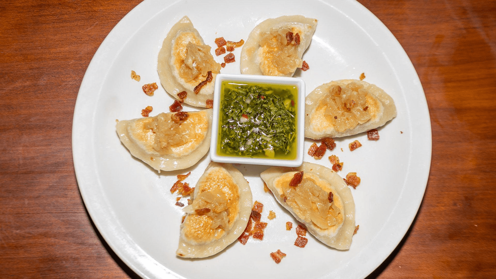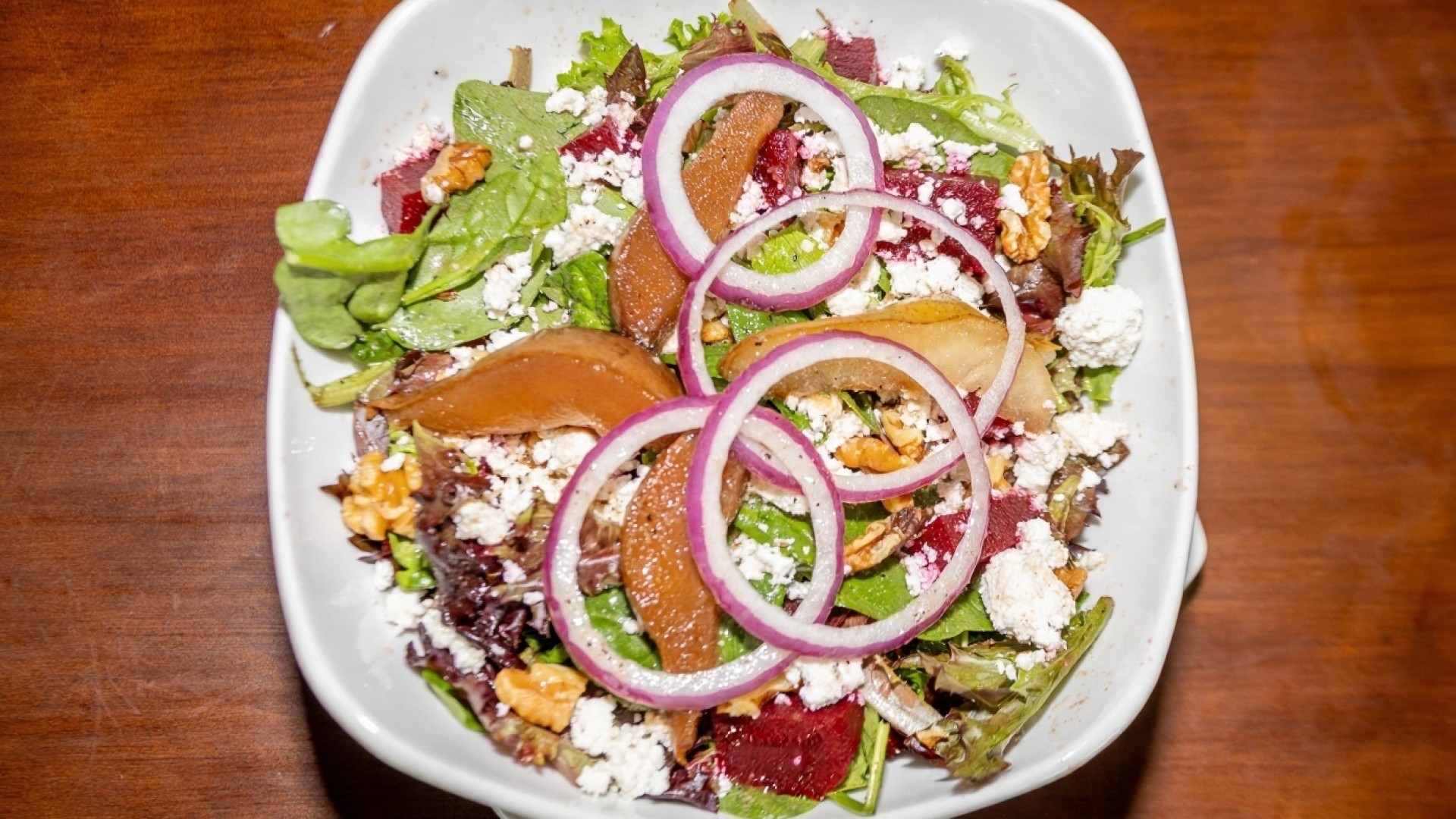 A fresh mix of greens and arugula, topped with homemade herb-infused farmer’s cheese, honey-ginger pears, pickled beets, red onion, and walnuts. Drizzled with a homemade pear-red vinegar dressing. Add three pan-seared Pierogi for $6.00