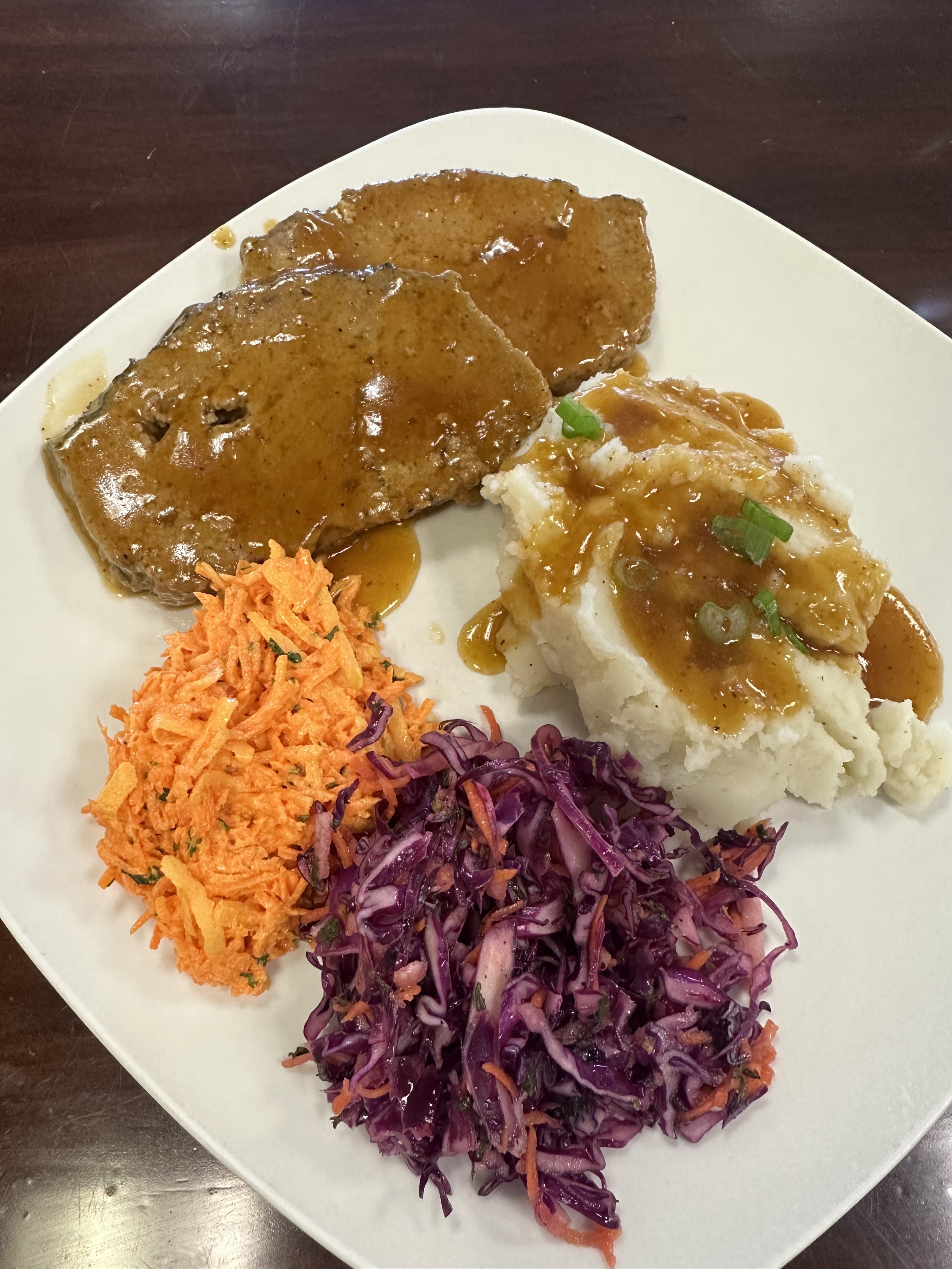 A hearty blend of beef and pork, served in a rich pork and beef bone sauce. Accompanied by mashed potatoes and a refreshing slaw of the day.