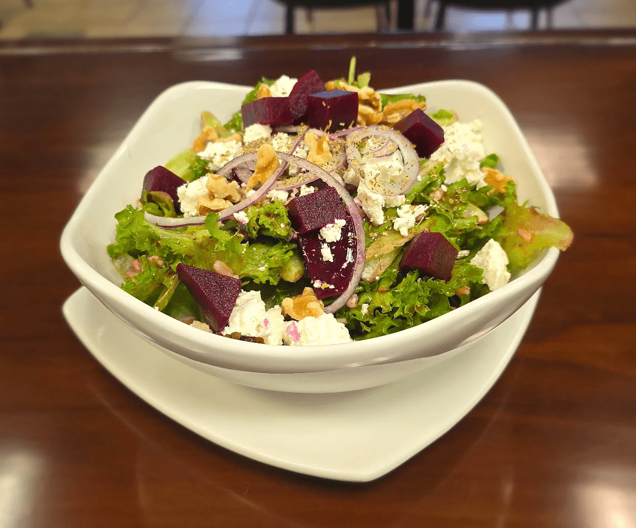 Mix greens, farro, pickled beets, crumbled goat cheese, red onion with a choice of balsamic vinegar or raspberry vinegar dressing