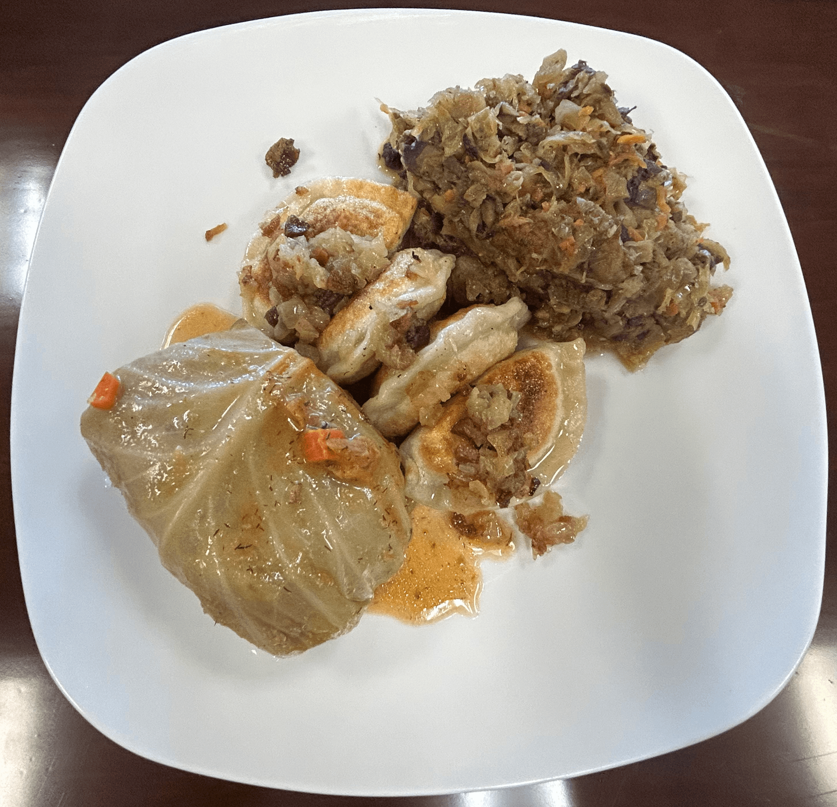 Hunter Stew, 1 pc of stuffed cabbage, 2 pcs of potatoes cheese and onion pierogi and 2 pcs of meat pierogi, Add Smoked Polish Kielbasa (Sausage) $5.00