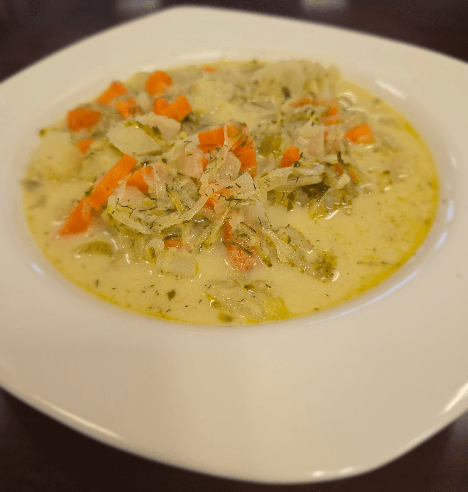 Shredded brine pickles, carrot, onions, celery, potatoes, dill cooked in a homemade chicken broth finished with heavy cream